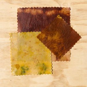 Telas teñidas con tintes naturales extraídos de desechos orgánicos, cubiertas con cera de abeja.