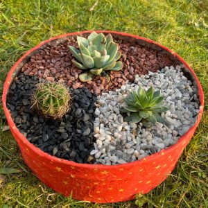 Reutilizando lata de galletas (19cm de diámetro), utilizando técnica de papel mache con servilleta, 100% artesanal, cactus y suculentas naturales.
